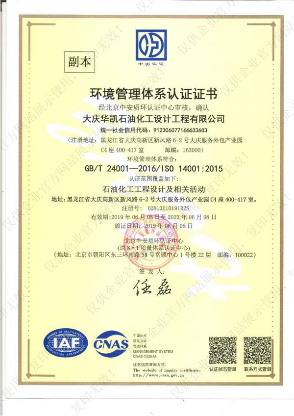 環(huán)境管理體系認(rèn)證證書